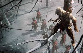 Connor stalking a squad of English soldiers from the trees